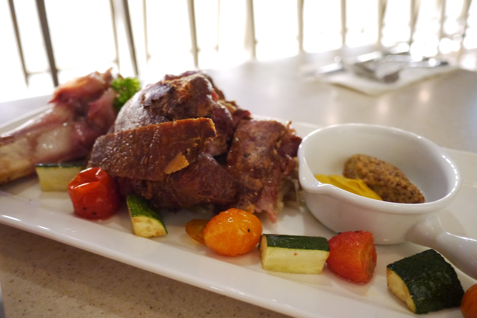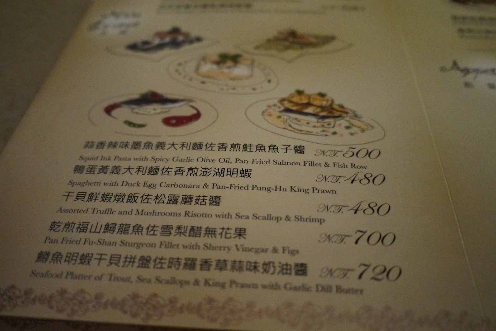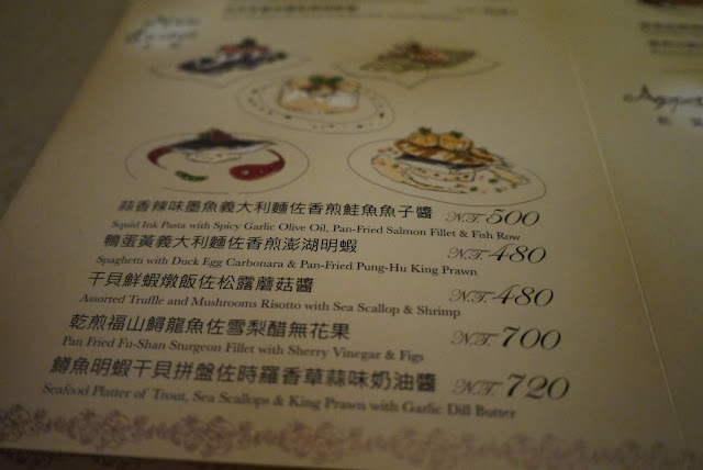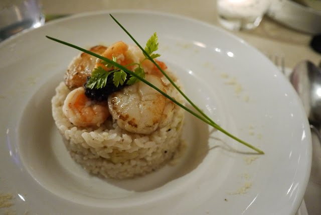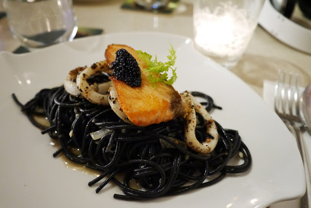 干貝鮮蝦燉飯佐松露蘑菇醬、香蒜辣味墨魚義大利麵佐香煎鮭魚魚子醬、德國豬腳