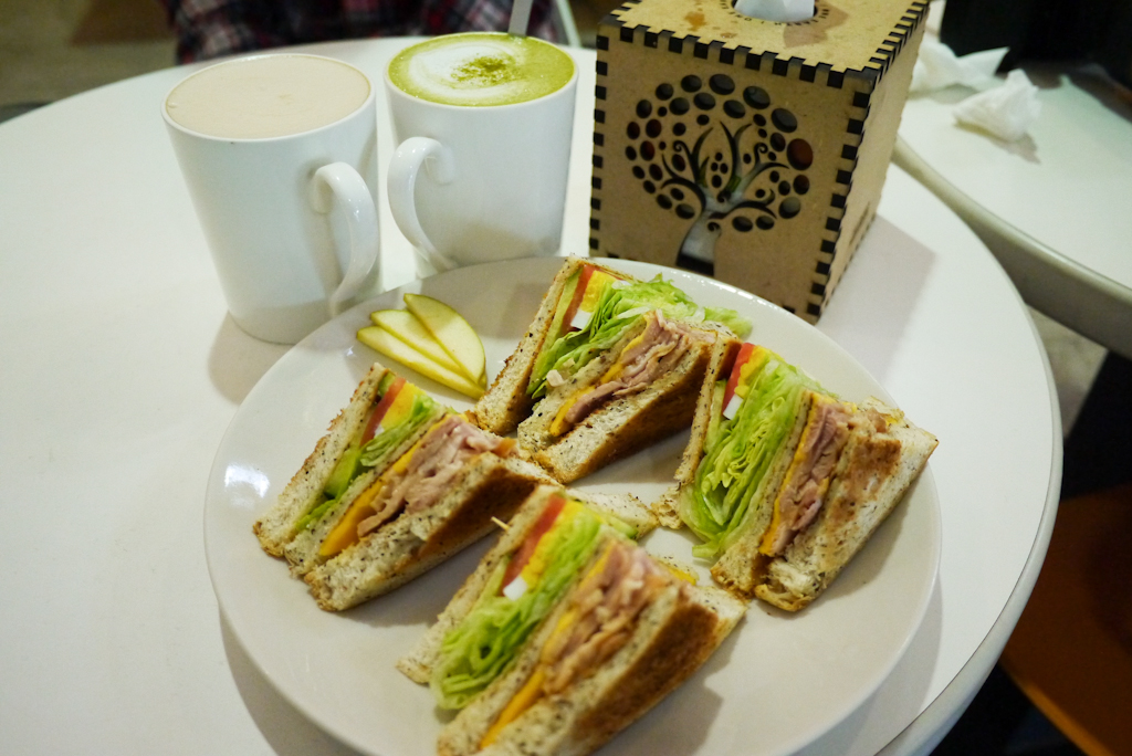 鮮奶茶(熱)、玄米抹茶拿鐵(熱)、燻雞三明治、香蕉巧克力鬆餅、墨西哥脆片佐莎莎醬